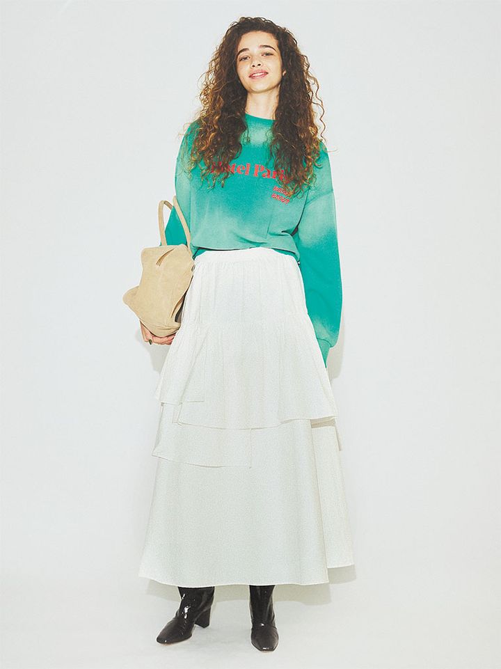 適度な重みで広がりすぎない上品に着られるスカート。軽さが欲しい厚着の季節に好都合な白は、変則的なティアードデザインがモードな面持ち。腰まわりはフラットで、厚手トップスとも好バランス。ナチュラルな風合いのコットン混素材。