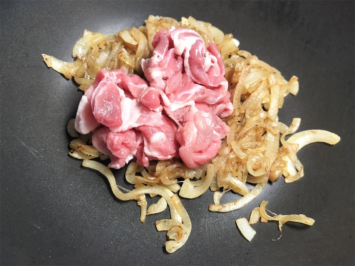 2. 豚肉を加えて軽く炒め、一度火を止めます。