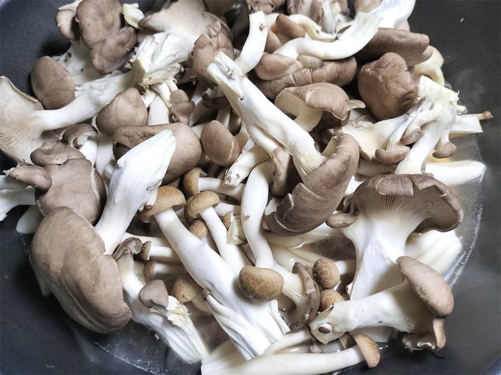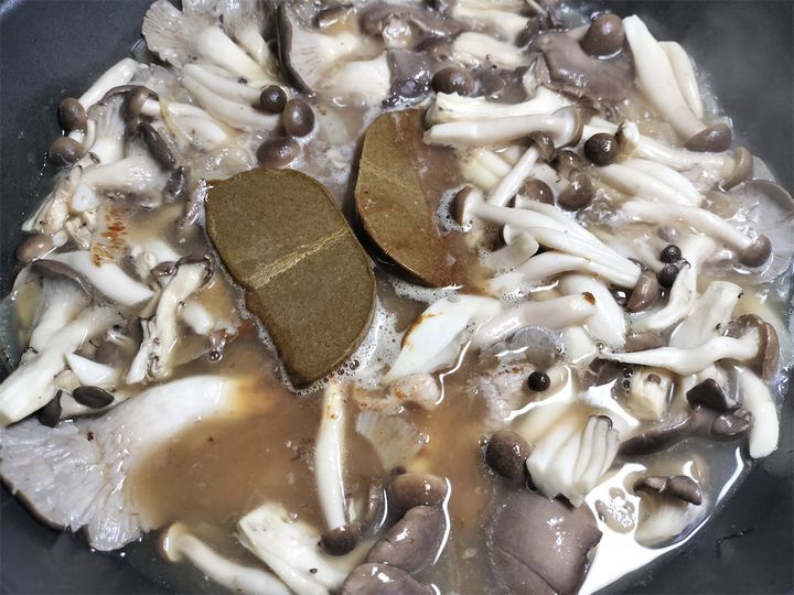 3. 水、ひらたけ、ぶなしめじを加えて強火にかけます。