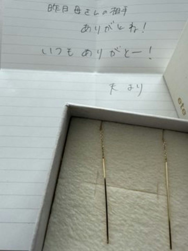 洗濯機の上に置かれていたのは、ご主人からのアクセサリーのプレゼント。しかもステキな手紙付きで、突然の夫からの愛情を感じて、みみさんはとても感動したそうです。家事に追われる日常の中で、予想もしないタイミングで訪れた粋なサプライズ。ご主人からの「君を大切に思ってるよ」の想いに、思わず泣いてしまいそうです。
