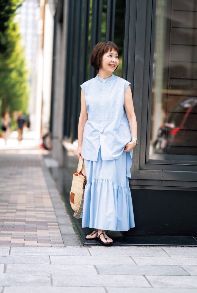 3. 【60代お手本スナップ】ブルーの服にシルバー小物の重ねづけで涼やかに仕上げた「優し気コーデ」〈東京〉