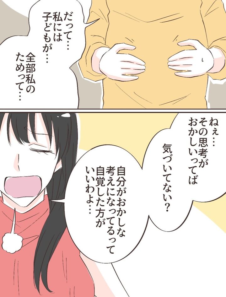 「だって・・私には子どもが・・全部私のためって・・」と自分に言い聞かせるように呟く私に、ユウコさんは「ねぇ・・その思考がおかしいってば。気づいてない?自分がおかしな考えになってるって自覚した方がいいわよ・・」と呆れたように言いました。