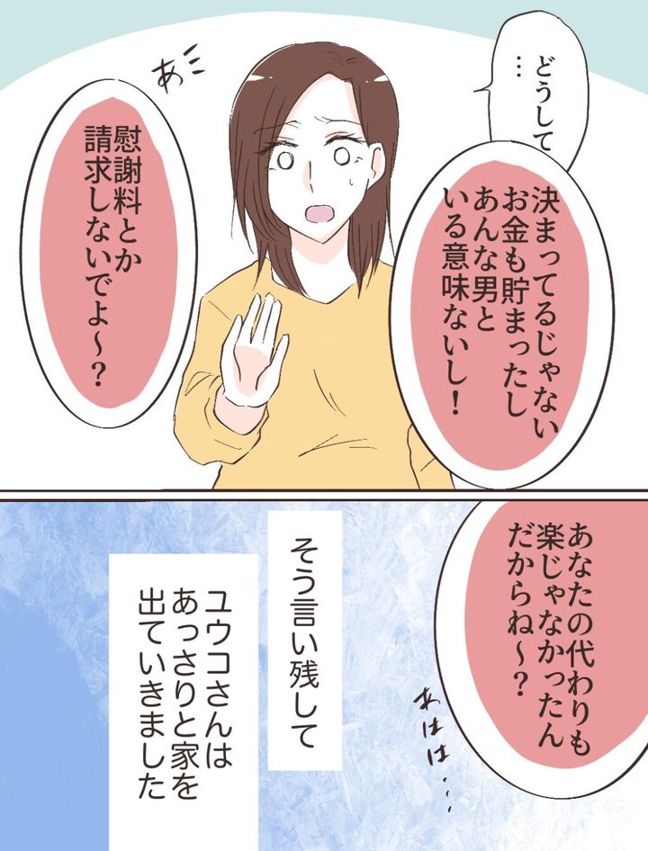 突然のことに「どうして・・」と困惑する私に「決まってるじゃない。お金も貯まったし、あんな男といる意味ないし!」ときっぱり言い放ったユウコさんは「あ、慰謝料とか請求しないでよ~?あなたの代わりも楽じゃなかったんだからね~?」と笑い、あっさりと私たちの家を出ていきました。ユウコさんが出ていった後、私は一人でユウコさんが言っていた言葉の意味を考えていました。