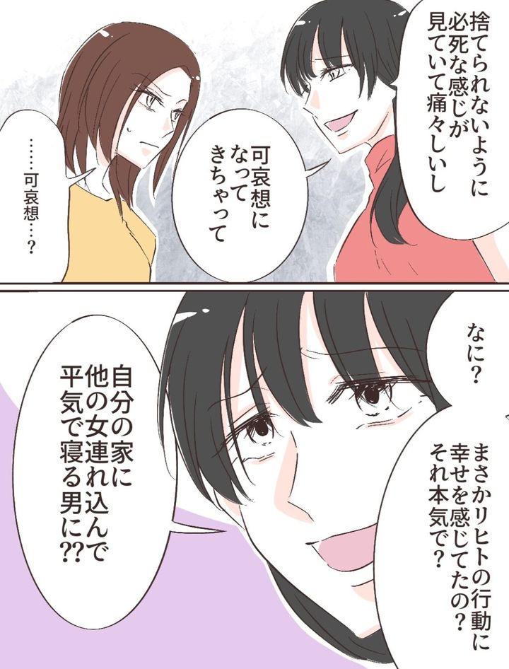 「捨てられないように必死な感じが見ていて痛々しいし、可哀想になってきちゃって」と憐れみたっぷりに言われ「・・可哀想・・?」と聞き返すと、「なに?まさかリヒトの行動に幸せを感じてたの?それ本気で?自分の家に他の女連れ込んで平気で寝る男に??」と馬鹿にしたように言われました。