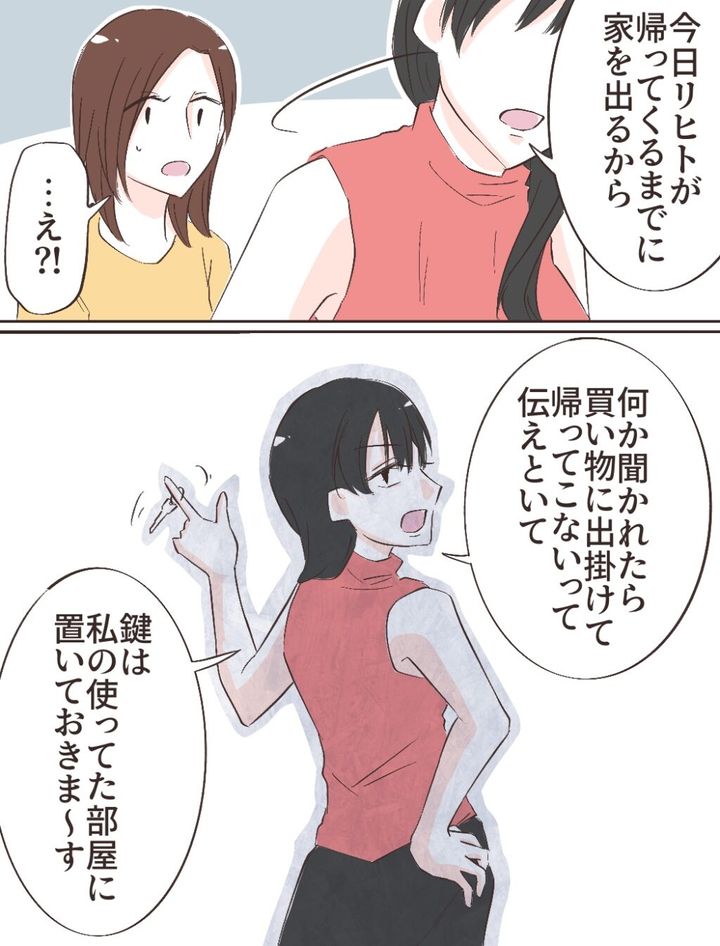 そして、「今日リヒトが帰ってくるまでに家を出るから」と言ってくるりと後ろを向いたユウコさんは、驚く私に「何か聞かれたら買い物に出かけて帰ってこないって伝えといて。鍵は私の使ってた部屋に置いておきま~す」と素っ気なく言いました。
