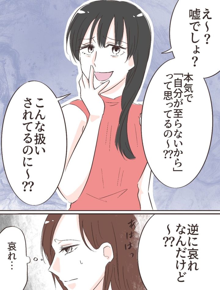 すると、「え~?嘘でしょ?本気で『自分が至らないから』って思ってるの~?こんな扱いされてるのに~??逆に哀れなんだけど~??」と馬鹿にしたように笑うユウコさん。「哀れ」と言われ惨めな気持ちになりました。