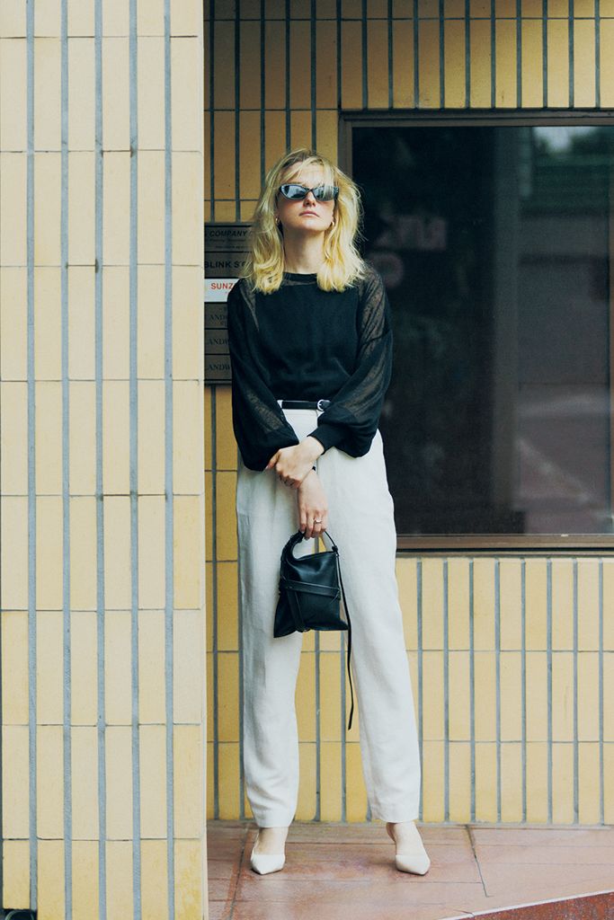 ニットのロンTとリネンのパンツをゆるめない、ベルトで引き締めるひと手間。先のとがったパンプスで、つま先まで細く、長くスタイルをつなげて。