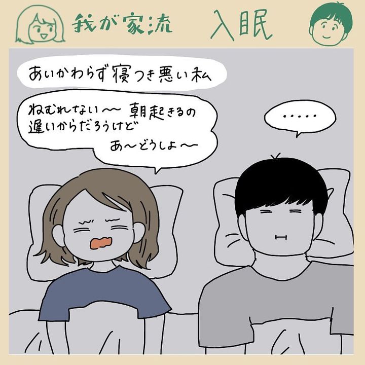こんにちは!Instagramで日々の暮らしを漫画で紹介している、Web漫画家のmomoです。夜、なかなか寝付けずに悩むわたしとは対照的に、夫はいつもあっという間に夢の中…。そんな夫から、ある日「いいこと教えてあげる」とある入眠法を提案されたのです。藁にもすがる思いで試してみましたところ、まさかの結果が待ち受けていました…。