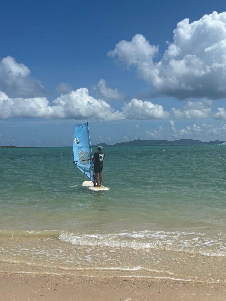 2日目は朝食を「Ooli Ooli」でとった後、朝から「ウインドサーフィン体験」に。小浜島でのアクティビティはほとんどホテルまで送迎付きなので迷わず向かうことができるんです!私は自他ともに認める運動音痴なので彼が体験するウインドサーフィンを見守ることに……。こちらのアクティビティでは希望すればドローンでウインドサーフィンを行っている姿を撮影もしてくれるので希望があれば言ってみてくださいね!※別途費用がかかります。ウインドサーフィンはレクチャーを含め、90分ほど。待っている間やウインドサーフィンを行う際、頭皮がかなり焼けるので帽子を持っていくことをオススメします。沖縄は本州の2倍ともいわれている紫外線量なのに、うっかり忘れた私は頭皮がとんでもなく真っ赤に後に泣くはめになりました……。ただ、浜辺で待っている間に野生のエイが2匹が突如浅瀬に現れ、思わず感動!
