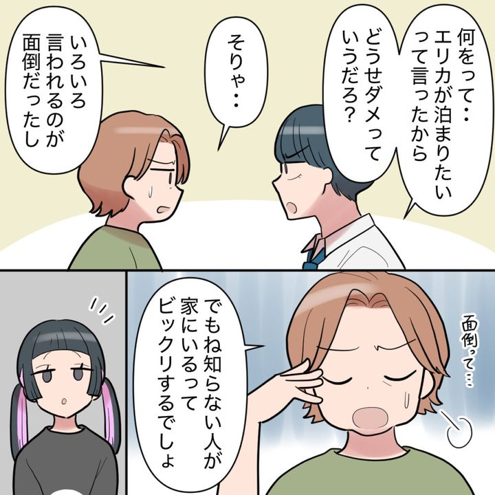 ミズキは「エリカが泊まりたいって言ったから。どうせダメっていうだろ?」と、最初から私に相談するつもりは無かったようです。私にいろいろ言われるのが面倒だったというミズキに「でもね、知らない人が家にいるってビックリするでしょ」とため息をつくと