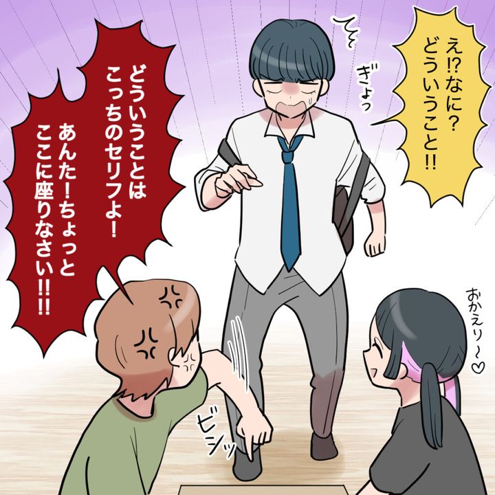 息子ミズキの部屋に窓から侵入していたエリカちゃん。もう6日も泊っていると聞いたところでミズキが帰ってきました。リビングで私と話しているエリカちゃんを見るなりギョッとして「え!?なに!?どういうこと!!」と言いましたがそれはこっちのセリフ!「あんた!ちょっとここに座りなさい!!」とミズキを座らせました。