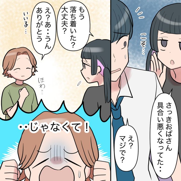 「さっきおばさん具合悪くなってた」とエリカちゃんがミズキに耳打ちしました。「もう落ち着いた?大丈夫?」と本当に私を心配する顔をしてたずねるエリカちゃんに、ちょっといい子かもと思ってしまいました。でもそうじゃないのよ!ミズキたちののん気な態度にこっちのペースが乱されます。