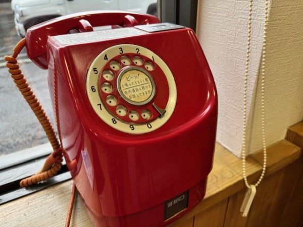 赤電話。もしかして使えるのかな?いやいや、今は使用できませんでした。あ!商品購入は現金をご用意くださいね。