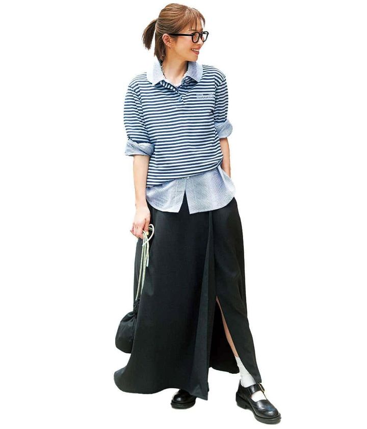 レイヤードを楽しみたい秋はポロシャツにシャツをINしてトラッドにアレンジ。スフレチークを頬とリップに乗せたヘルシーメークに、伊達メガネでキリッと引き締めて。ふんわりピンクの血色感がスポーツMIXの着こなしに嫌みのない色っぽさをプラス。