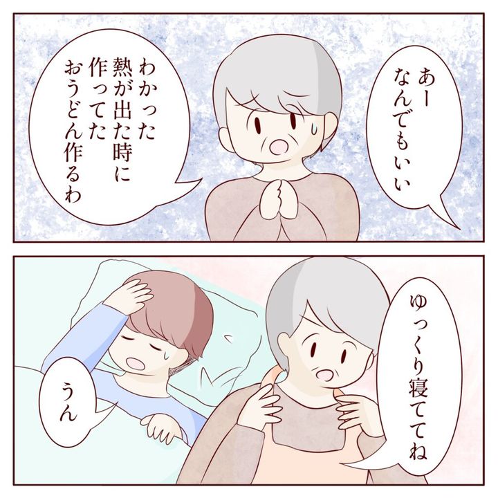 「あーなんでもいい」とマサキが答えると、義母は「わかった。熱が出たときに作ってたおうどん作るわ」と言い、すぐさま持参したエプロンを取り出し「ゆっくり寝ててね」と言って寝室から出て来ました。