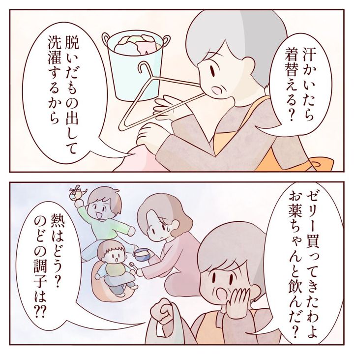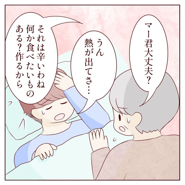 その後も義母は「汗かいたら着替える?」「脱いだもの出して。洗濯するから」などと何度もマサキの様子を見に行ったり「ゼリー買ってきたわよ。お薬ちゃんと飲んだ?」「熱はどう?のどの調子は??」と付きっ切りで看病していました。