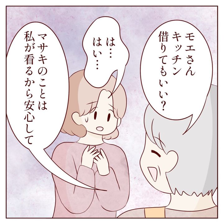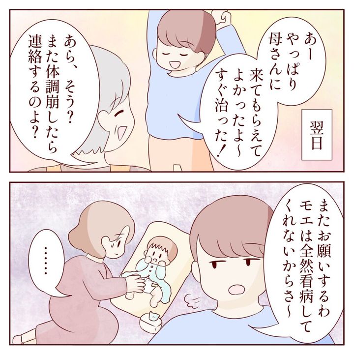 マサキさんから「看病してほしい」と言われてやってきた義母。息子に頼られたことが嬉しいのか、義母はお泊まりセットやエプロンを持参するなど準備万端でやってきて「マサキのことは私が看るから安心して」とモエさんににっこり。義母は過剰なほどマサキさんを心配し、まるで小さな子どもの看病をするように何から何までやってあげました。翌日、熱も下がりすっきりした顔で起きてきたマサキさんは、モエさんの前でわざと「やっぱり母さんに来てもらえてよかったよ。モエは全然看病してくれないからさ」と義母に言いました。