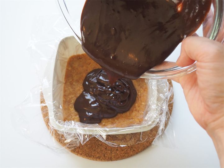 6. 3で冷やしておいた密閉容器を冷蔵庫から取り出し、5のチョコレートを流し入れる。表面を軽く整え、ラップをして冷蔵庫で3時間以上冷やし固める。