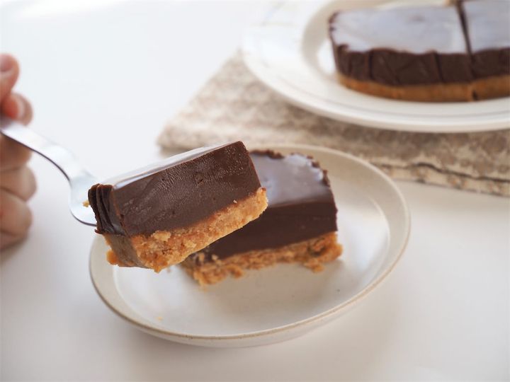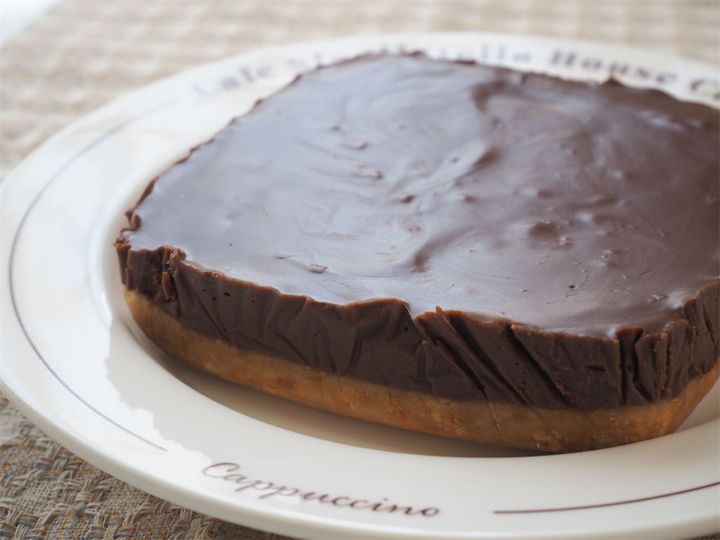 しっかり冷やすと、フォークがスッと入るほどのなめらかさ。口に入れると、テリーヌのように濃厚で、まさに“生チョコ“の味わいです。卵や生クリームを使っていないとは思えぬほど、コクのある口溶けに仕上がっています。下に敷いたクッキー生地もしっとりしていて、全体のまとまりもとってもいいですね。今回は13cm角の容器で作ったところ、高さはやや控えめでしたが、満足感は十分でした。チョコ好きならきっと満たされる、そんなタルトです。