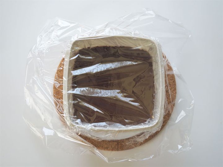 syun cookingさんは10cm角の正方形の密閉容器を使用。冷やし時間は明言されていませんが、次の工程を進めている間冷やしておけば大丈夫そう。今回は目安として10分ほど冷やしました。