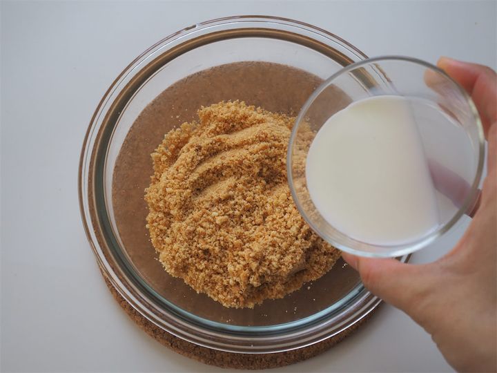 2. 1で砕いたクッキーに牛乳(30ml)を加え、ムラなくなじむまでしっかり混ぜる。