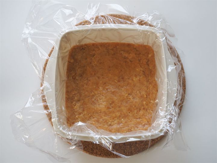 3. ラップを敷いた密閉容器に2のクッキー生地を入れ、スプーンなどで押し固めるように敷き詰める。表面はできるだけ平らに整えて、冷蔵庫で冷やしておく。