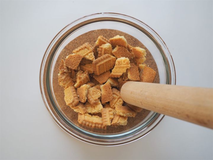 1. ボウルにクッキーを入れ、細かく砕く。
