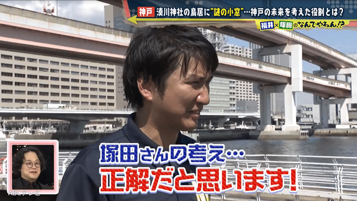 その結果、福井アナの予想は大ハズレ。「なんか福井さんに替わってから微妙な点数ばっかりですね」と道谷先生に笑われ、福井アナは撃沈した。一方、塚田予想の「平和」というキーワードは、道谷先生いわく「ちょっとかすっている」のだとか。道谷先生によると小窓には、「神戸の未来を考えた地元の方々の思い」が関係していて、「鳥居に隠された重要な役割と同じ役割をしているものが、メリケンパークのどこかにあります」とのこと。