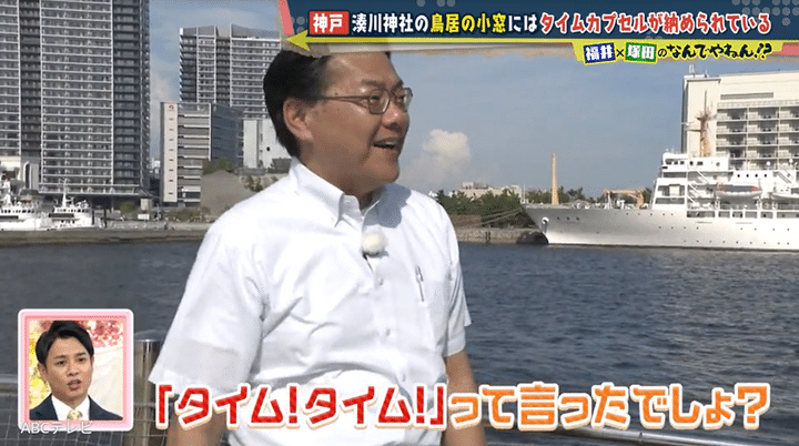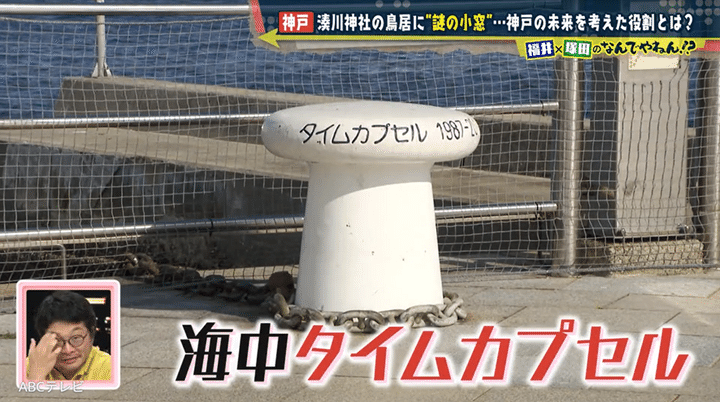 しかし推理の結果は、100点満点中0点! 警鐘(警報)といった音関連は、謎に全く関係なかった。福井アナと塚田が本来見つけるべきものは、神戸海援隊のオブジェ近くにある白い謎の物体。その正体は、海中タイムカプセルの在り処を示すものだ。このタイムカプセルは、神戸開港120年を記念して1987年に海へ沈められたもの。30年ごとに引き上げられて、その都度中身を入れ替えている。