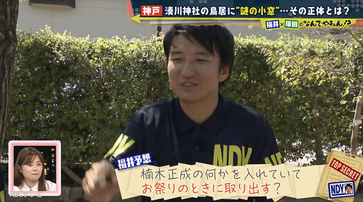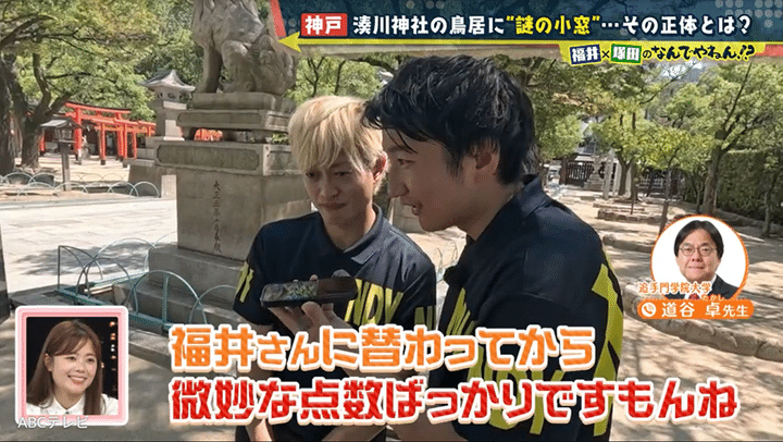 なお、湊川神社の鳥居の謎は、「福井×塚田のなんでやねん!?」9月23日放送回で紹介された。