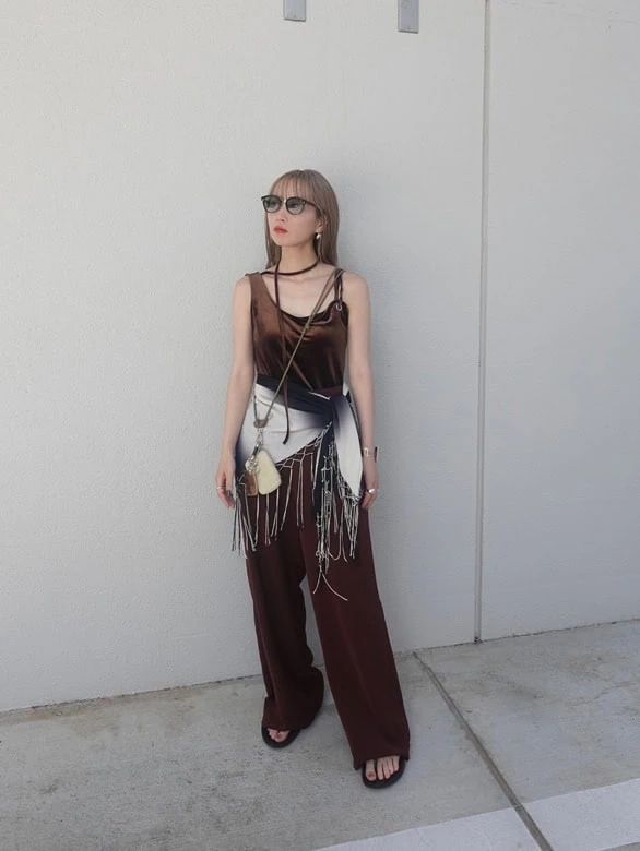 今年の秋の注目・ベロア素材のアイテムを投入。ベロアキャミと同系色のパンツを合わせ、セットアップ風な着こなしに。アクセントとして腰に巻いたスカーフにもセンスを感じる!