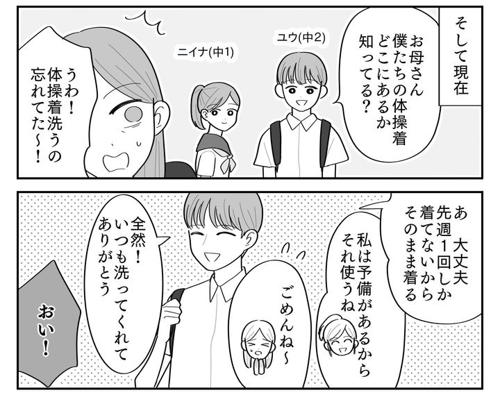結婚してから十数年の月日が流れ、息子のユウと娘のニイナは中学生。私は仕事をしながら家事をこなし、毎日バタバタです。ある月曜の朝のこと。慌ただしく準備をしていると、学校へ出かける子どもたちが体操服を探していて……。
