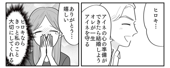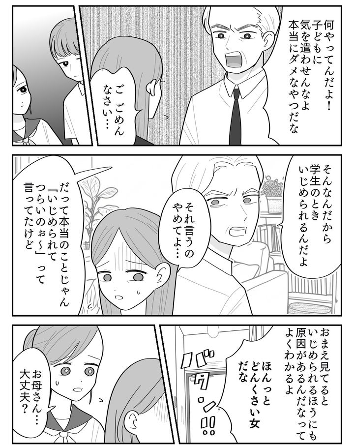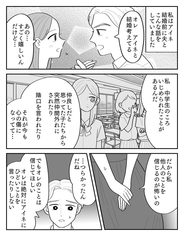 私はアイネ。中学生時代にいじめられた経験があり、長い間それが心の傷になったままでした。しかし当時付き合っていたヒロキにそれを伝えると、「オレが一生守る、信じてほしい」と言ってくれたのです。私はそんなヒロキのことを頼もしく感じ、幸せになれると信じてプロポーズを受け入れました。現在は息子のユウ(中2)、娘のニイナ(中1)と家族4人で暮らしています。しかしあれから月日が経ち、ヒロキはすっかり変わってしまいました……。