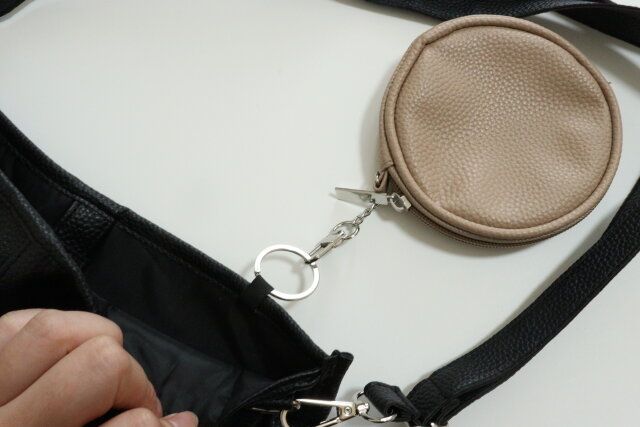 内側にはキーリングが付いているので、フック付きの小物入れなどを取り付けられます。