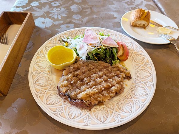 シャリアピンステーキと付け合せのパン。野菜の彩りがキレイです