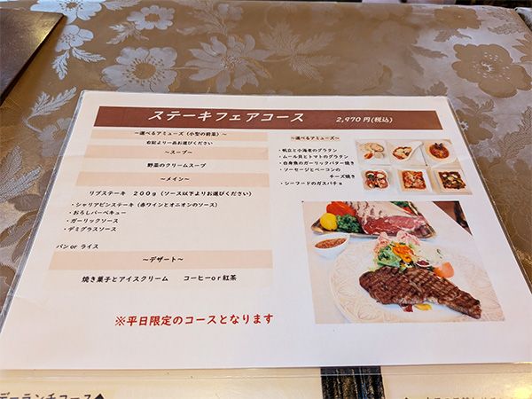 どれも美味しそうで迷ってしまいますが、今回は平日限定のステーキフェアコースを選択しました。