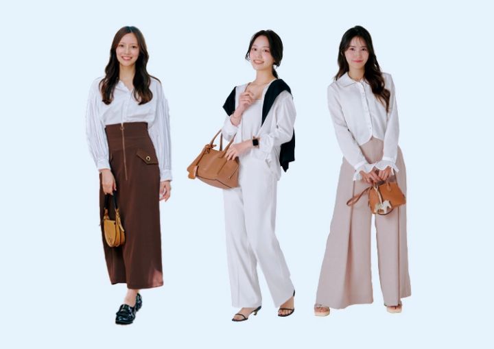 「シワになりにくく、ボタンの配置などほかにないデザインが魅力のシャツは持っているだけで気分が上がる1枚。全体はカラーレスでまとめ、秋らしいブラウンのバッグをアクセントに。UNIQLOのUVカット機能付きカーディガンを羽織れば初秋の寒暖差に対応可能」(広告会社勤務/佐野柚衣さん・25歳)