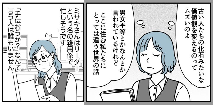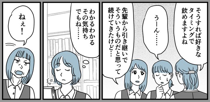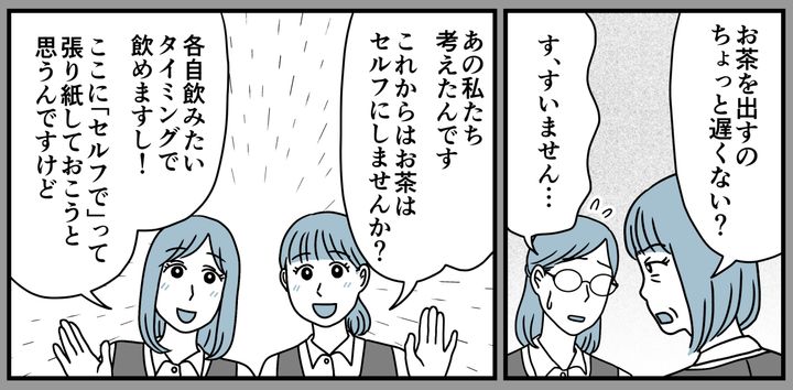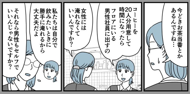 古い価値観を変えるのは簡単じゃありません。「コーヒーは各自で!」とか「女性から男性へのお茶出しは禁止!」とか、本社から通達でも出されないかぎりこの職場は変わらないでしょう。いや……たとえ出されても無理かもしれません。