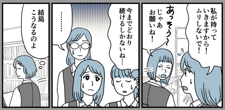 私はアイ(28)。高校を卒業し、地元採用で就職して入社10年目。現在は夫婦2人暮らしです。職場では若手の女性社員のなかから毎年1人、リーダーという名の雑用係を決めています。けれど私は打診されるたび、のらりくらりと拒否しつづけてきました。余計な仕事が増えるだけだし何のメリットもないからです。今回は本社から異動してきたばかりのミサキさんに決まりました。世の中、優しければ優しいほど損をする……。私はそんな生き方をしたくありません。