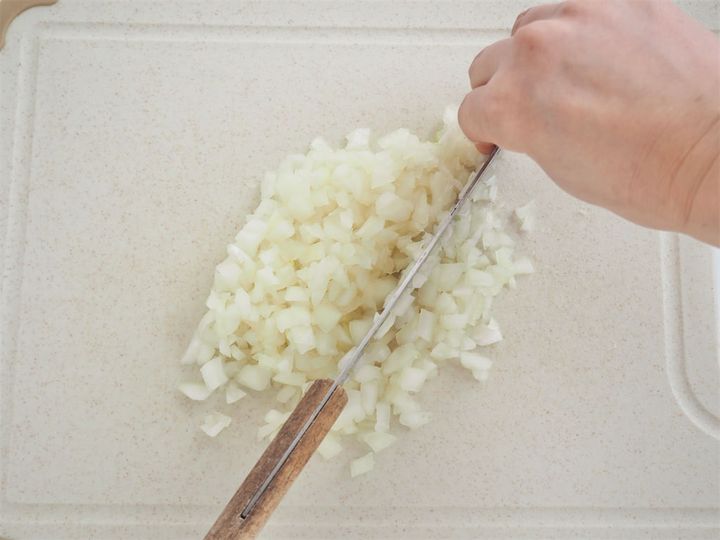 1. 玉ねぎ1/2個をみじん切りにする。