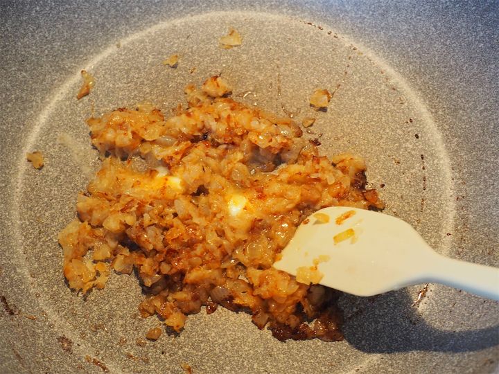 7. 脂身を取り出したら、1、塩、2の果肉を入れ、飴色になるまで炒める。焼いたら器に取り出す。