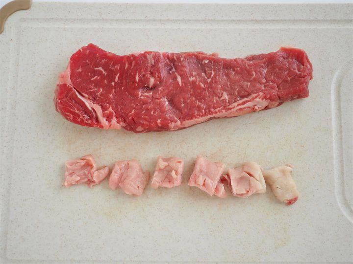 3. 牛肉の脂身を切り落とし、切り落とした脂身を角切りにする。