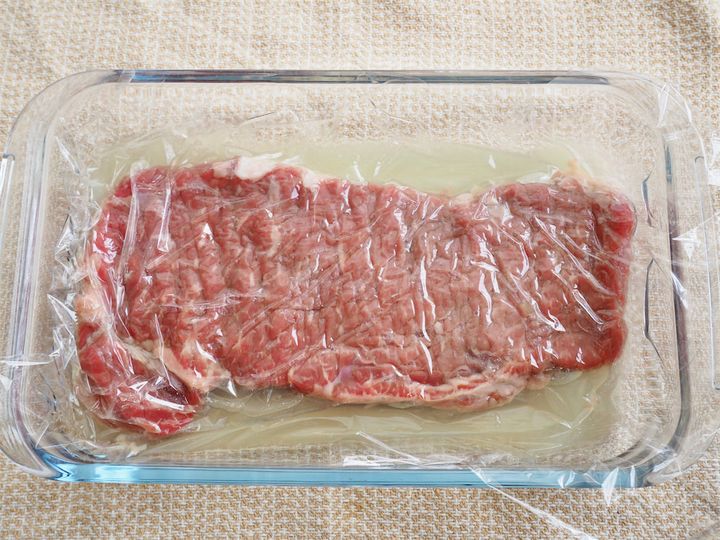 牛ステーキ肉は、上等なものでなくていいそうです。今回は、スーパーにあった牛ロースのステーキ肉を使用。