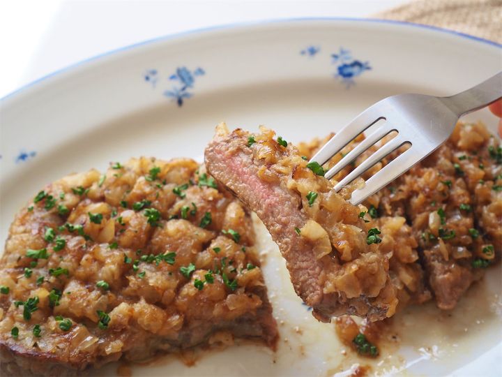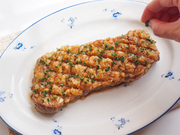 玉ねぎの甘みや旨味がじゅわっと広がって、肉の旨味をぐっと引き立ててくれる――そんな“旨味の爆弾“のようなステーキ。肉はとにかくやわらかく、バターの香ばしさが鼻から抜けるたびに食欲が加速。そこにふわっと香るパセリの爽やかさが加わって、味に立体感が生まれます。チーズのようなコクも感じられて、「こんなものが家で食べられるなんてうれしすぎ…!」としみじみ。本家レシピでは粗びき黒こしょうも使われているようだったので追加してみると、それがまた最高に合う!たっぷりめにかけるのが個人的にはおすすめです。