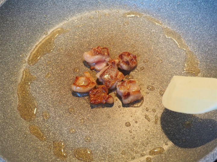 脂がじんわりにじみ出し、表面に香ばしい焼き色がついてきたら、脂身を取り出しましょう!