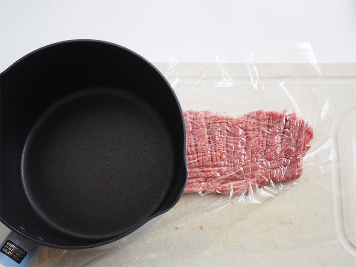 4. 3の牛肉を包丁の背で叩いたら、ラップをかけさらに鉄板を縦にして叩き、薄く延ばす。