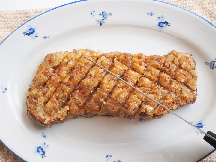 焼き上がると肉が少し縮んで厚みが増すので、思いきって大胆に叩き伸ばしておくと、食感も均一でより本格的な仕上がりに。飴色玉ねぎに濃いめの焼き色が少しついてしまい落ち込んだ瞬間もありましたが、実はこれが“いい味“になっていて、結果オーライでした。香ばしさを含んだ玉ねぎの旨味や風味を、余すことなく堪能できます。「くぅー!」と思わず声が出る満足感。次、何か特別なお家ご飯があったらメニューに追加しよう!ぜひいつか“本物“も食べてみたいなぁと感じました。