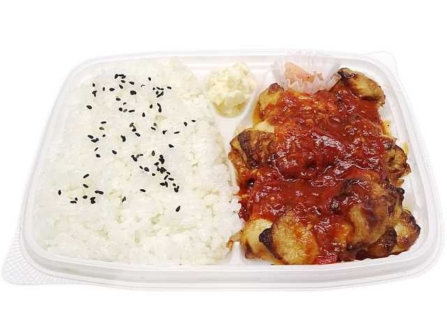 ジューシーな鶏肉を、にんにくを効かせたコクのあるトマトソースで味わうお弁当です。