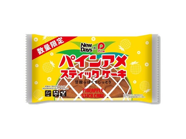 甘酸っぱくてジューシーな「パインアメ」とのコラボ商品。パインアメ風味のパイン餡がはいった、爽やかな味わいのスティックケーキです。