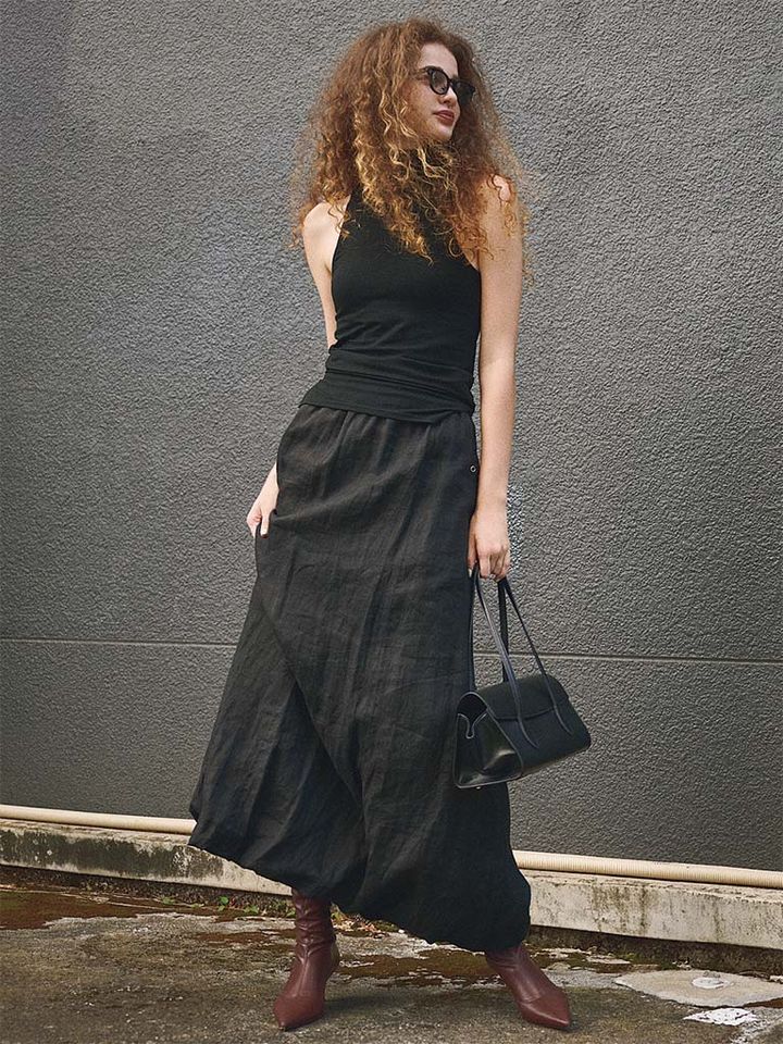 すそがほのかに丸みを帯びるバルーンシルエット。動きに合わせてふわりと舞うような素材感で見た目も着心地も軽やか。ドライな質感も相まって、まっ黒でも圧迫感が出すぎないワントーンのメリハリづけにも効果的。
